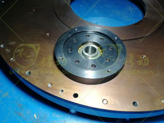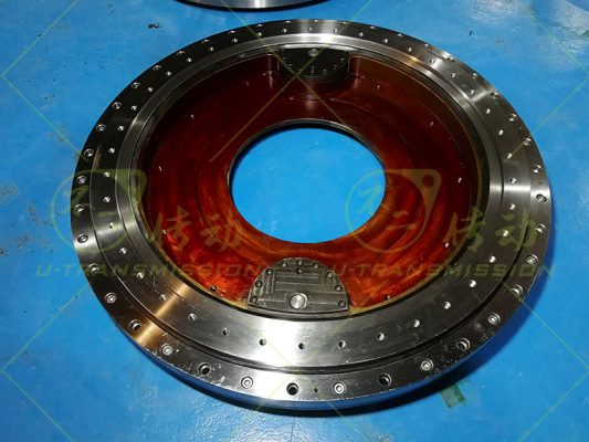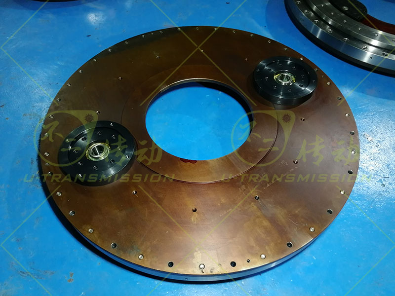 S-III-I-1300-2內(nèi)齒雙驅(qū)齒輪式回轉(zhuǎn)驅(qū)動使用在自動化設(shè)備上,客戶的設(shè)備外部空間受限,部件需要盡量安裝在齒輪式回轉(zhuǎn)驅(qū)動的內(nèi)部,設(shè)備底部有足夠的安裝空間,設(shè)備運(yùn)轉(zhuǎn)需要大輸出扭矩,設(shè)備轉(zhuǎn)速低,需要大的總減速比。綜合上述客戶需求,不二傳動為客戶設(shè)計(jì)了內(nèi)齒雙驅(qū)齒輪式回轉(zhuǎn)驅(qū)動,內(nèi)齒傳動,輸入端靠近圓心,可以保證外徑是整圓,減速電機(jī)可以安裝到靠近圓心的位置,不占用外部空間。設(shè)備底部有安裝空間,驅(qū)動的輸入端就設(shè)計(jì)在底面上,方便客戶使用。針對客戶需要大減速比,大扭矩,不二傳動采用了小模數(shù)齒,雙齒輪傳動,小模數(shù)保證大減速比,雙齒輪保證大輸出扭矩。這一設(shè)計(jì)解決了客戶的問題。