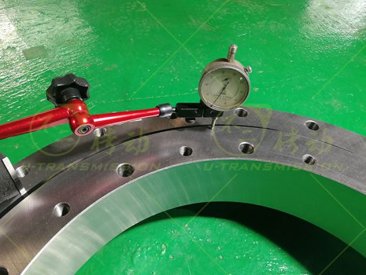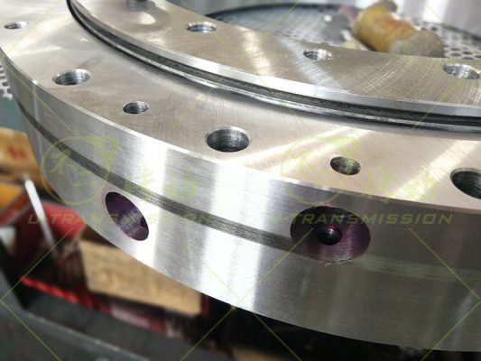 020.25.560 精密雙排球回轉支承客戶用在破碎設備上,轉速60轉/分鐘,由皮帶輪直接帶動旋轉,雙排球回轉支承具有轉速高,載荷大,抗傾覆能力好,運轉平穩等特點,加工的難點是保證兩排溝道位置一致還需要保證兩排溝道平行,只有這樣兩排鋼球才能同時受力,才是真正意義上的雙排球,加工不好的話只有一排鋼球受力,就變成單排球回轉支承了,失去了使用雙排球回轉支承的意義。
