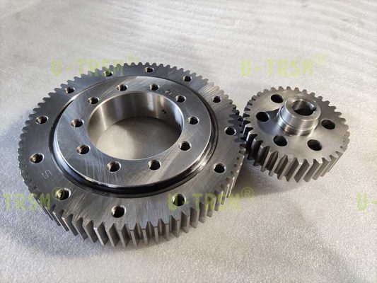 這是型號為011.16.160的精密四點球回轉支承及配套小齒輪,客戶用在自動化設備上。回轉支承和齒輪都要求高精度磨齒,并且回轉支承要求0游隙,端跳和徑跳要小于等于0.02mm,旋轉靈活。最終實測負游隙,旋轉靈活,端跳、徑跳≤0.015mm。齒輪和回轉支承齒圈均達到6級齒精度要求,完全滿足客戶的使用要求。