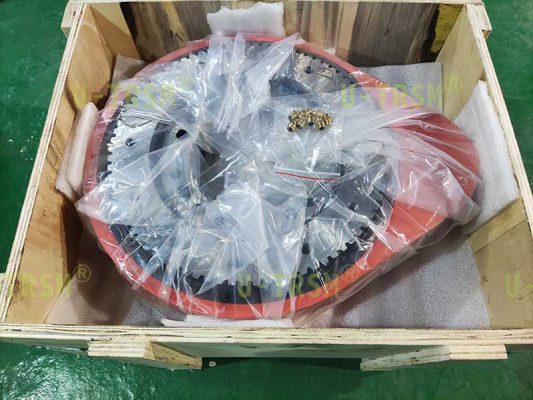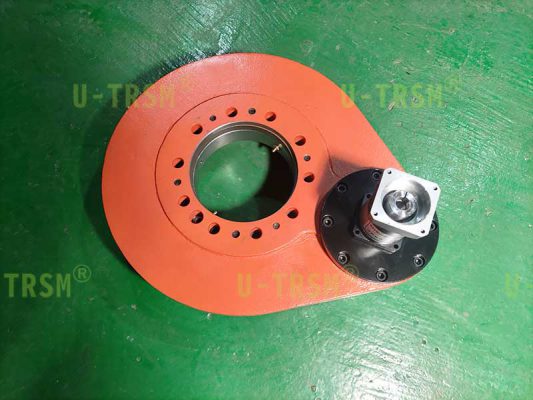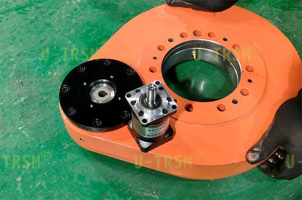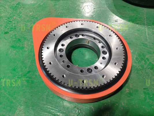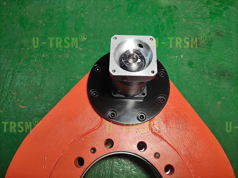 S-I-O-0229 精密直齒回轉驅動應用在工業自動化設備上??蛻羰褂盟欧姍C為回轉驅動提供動力,讓我們配套精密行星減速機,要求齒嚙合圓上的齒間隙≤0.1mm,這也就意味著回轉支承的游隙和徑向跳動都要做的非常小。