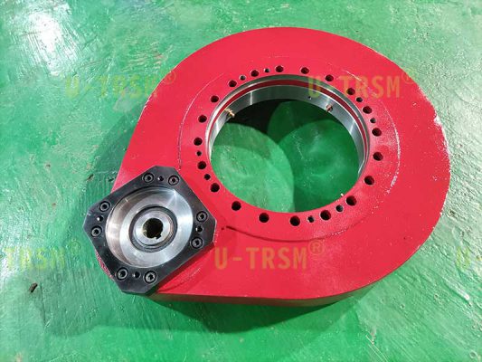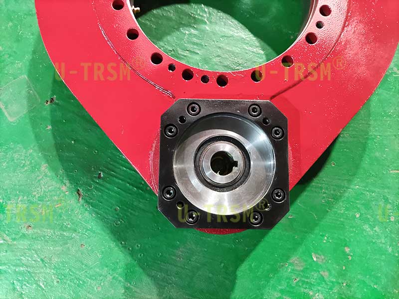 S-I-O-0311齒輪式回轉驅動是一款應用在機床設備上的精密型產品。跟一般產品不同的是,這款回轉驅動裝置在機床設備上需要反向安裝,也就是外圈轉動的軸承圈向下帶動客戶的工裝對工件進行旋轉,并且需要很高的回轉精度。