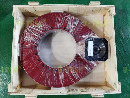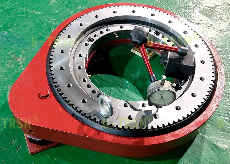 這款回轉驅動內部的回轉支承是負游隙,還對齒進行磨齒加工。所謂的負游隙就是回轉支承的滾動體和溝道過盈配合,這樣的配合可以保證內圈和外圈之間沒有晃動,檢測表現為測量回轉驅動的游隙為零,負游隙的回轉支承運轉平穩,不會損失回轉精度。
