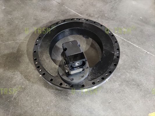 S-II-I-0541內齒精密適配90°減速機的回轉驅動應用在自動化設備精密轉臺下面,行星減速機和伺服電機可以安裝在底座內部,節約外部空間。底座高度不能過高,伺服電機不能直接連接行星減速機,選擇直角減速機將伺服電機的安裝方向變成水平方向。這樣設計客戶設備整體美觀,布局合理,安裝維修方便。