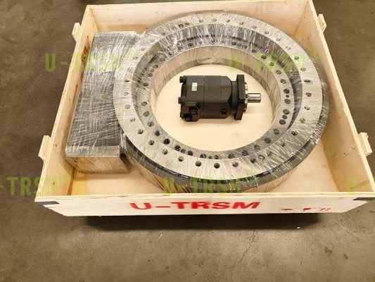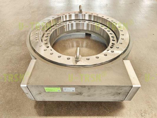 不二傳動(dòng)設(shè)備(洛陽)有限公司給客戶設(shè)計(jì)了一款大模數(shù),大扭矩,豎直安裝使用的蝸輪蝸桿式回轉(zhuǎn)驅(qū)動(dòng)。該回轉(zhuǎn)驅(qū)動(dòng)用在大型自動(dòng)化設(shè)備上,豎直安裝使用,載荷較大,并伴隨很大的傾覆力矩,回程旋轉(zhuǎn)時(shí)要求穩(wěn)定平順。經(jīng)過與客戶的多次溝通,不二傳動(dòng)的設(shè)計(jì)師根據(jù)客戶工況,推薦使用蝸輪蝸桿式回轉(zhuǎn)驅(qū)動(dòng),并使用大模數(shù)來增加回轉(zhuǎn)驅(qū)動(dòng)的扭矩,根據(jù)齒承載及力學(xué)性能分析,輸出扭矩可達(dá)近200KNm。
