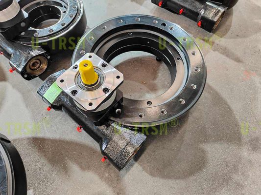 精密14寸回轉驅動配套行星減速機應用在特重設備上,使用特點是轉速特別低,需要大的減速比,輸出扭矩要求小,要求精度較高,并且底座和轉臺外側都沒有空間安裝減速機和電機,電機和減速機只能安裝在底座和轉臺中間的夾縫中。