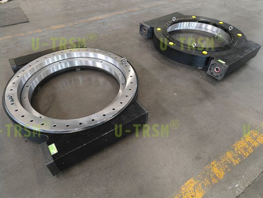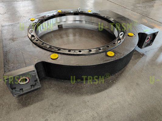 此款回轉驅動應用于高原低溫環境中,載荷大,扭矩大,使用環境在-40-50°C,并且要求高精度。回轉驅動中的回轉支承需進行全磨加工,保證尺寸的精準,表面無任何劃傷,在零部件加工及搬運過程中做保護處理。此款回轉驅動輸出扭矩可達230kNm,保持力矩可達1400kNm,載荷可達350t,回程間隙≤0.05°,保證回轉驅動的整體氣密性,采用加裝高質量硅橡膠密封,不二傳動設計工程師根據客戶的使用要求,研發了此款回轉驅動。